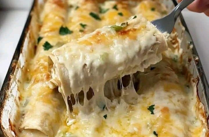 Ces enchiladas au poulet blanc sont une version riche et crémeuse du classique. Du poulet effiloché et des piments verts sont roulés dans des tortillas moelleuses, nappés d’une sauce blanche à la crème sure maison et cuits au four jusqu’à ce qu’ils soient bouillonnants.