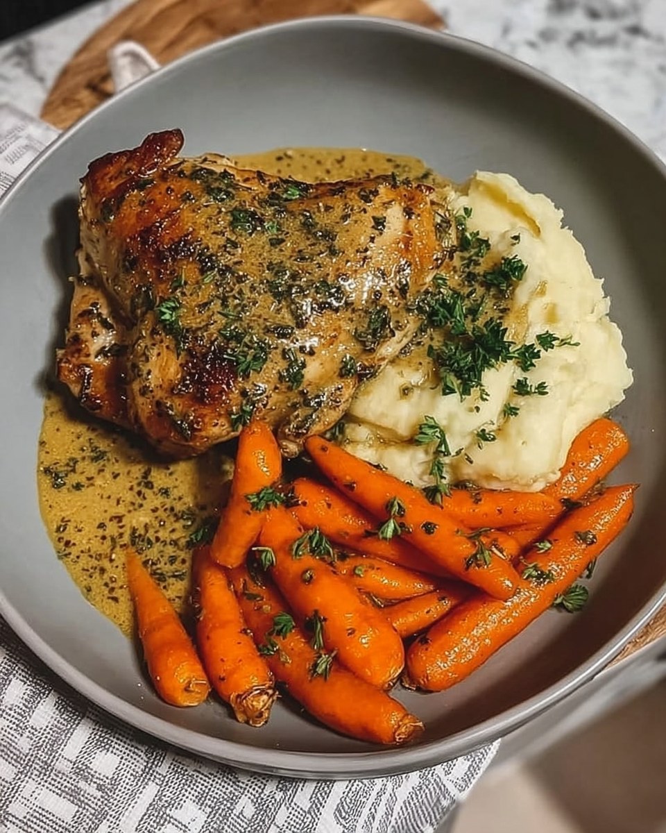 Verser la purée dans un bol, garnir de poulet aux herbes et de carottes rôties. Napper du jus de cuisson pour une touche finale savoureuse.