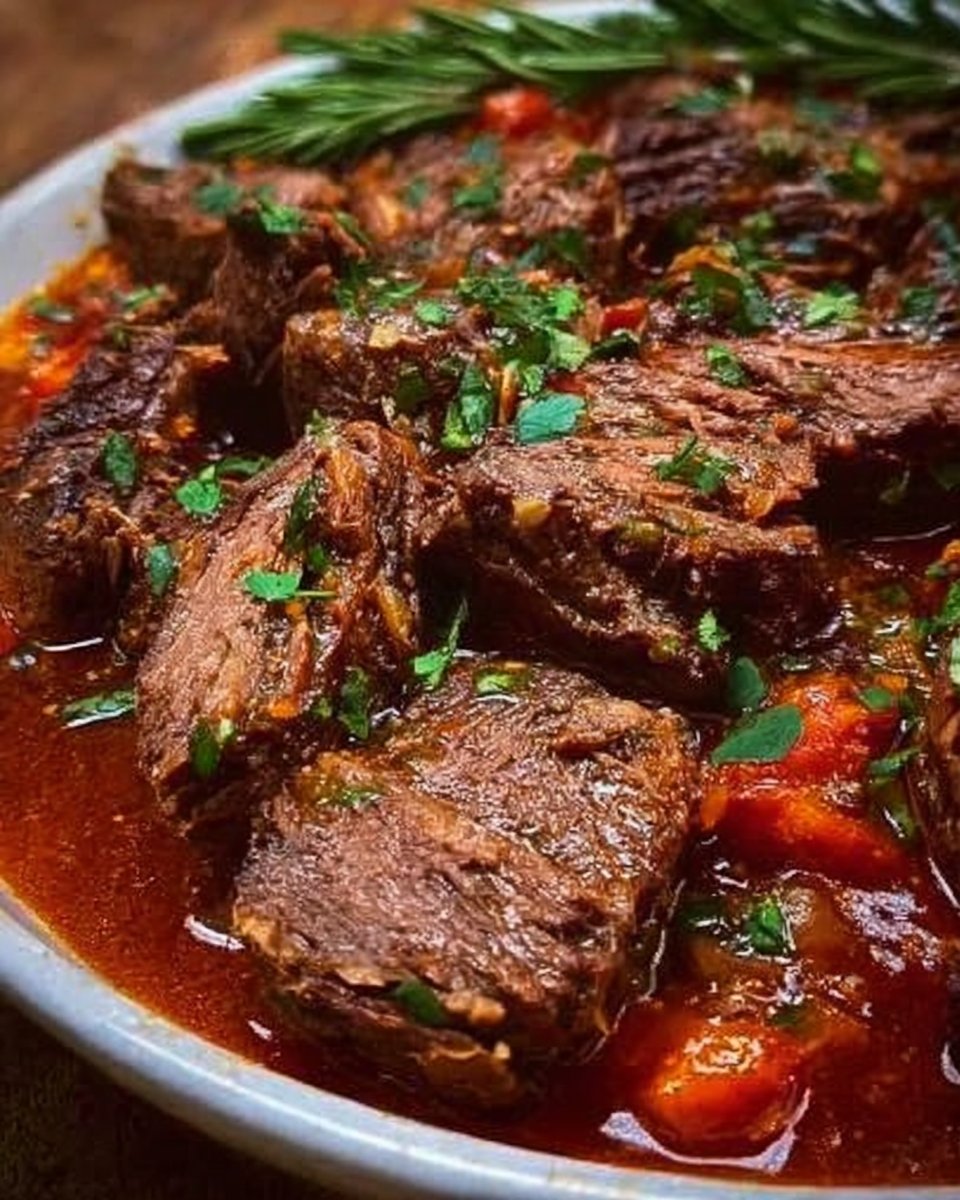 6. Porter à ébullition. Réduire le feu, couvrir et laisser mijoter doucement pendant 2 à 3 heures, jusqu’à ce que la viande soit tendre. 7. Avant de servir, parsemer le rôti de persil frais pour une belle touche de couleur et un parfum frais.