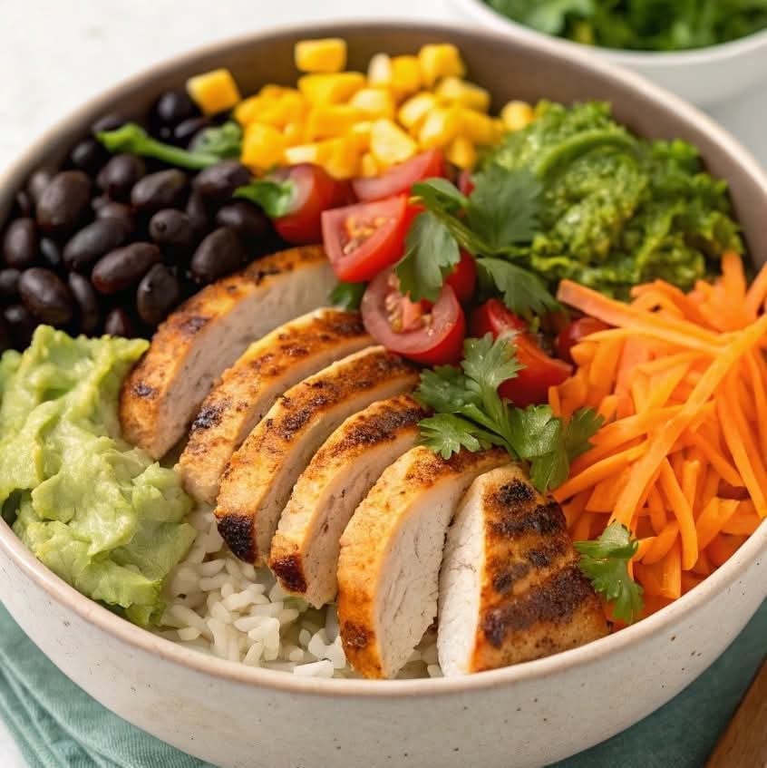 4️⃣ Disposer le poulet, les haricots noirs, le maïs, les carottes, les tomates et le guacamole sur le dessus.