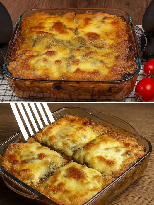 Une fois cela fait, répartissez la moitié des aubergines dans un plat de cuisson carré en verre, remplissez de viande hachée et de légumes sautés, puis recouvrez avec les aubergines restantes et garnissez la surface avec le Galbanino tranché et le parmesan râpé.