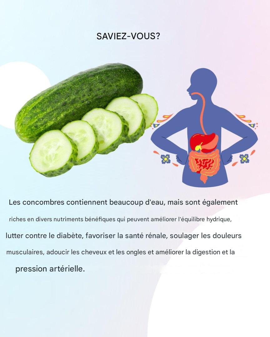 Rafraîchit l’haleine : Mâcher un concombre peut aider à éliminer les bactéries dans la bouche et améliorer l’haleine.