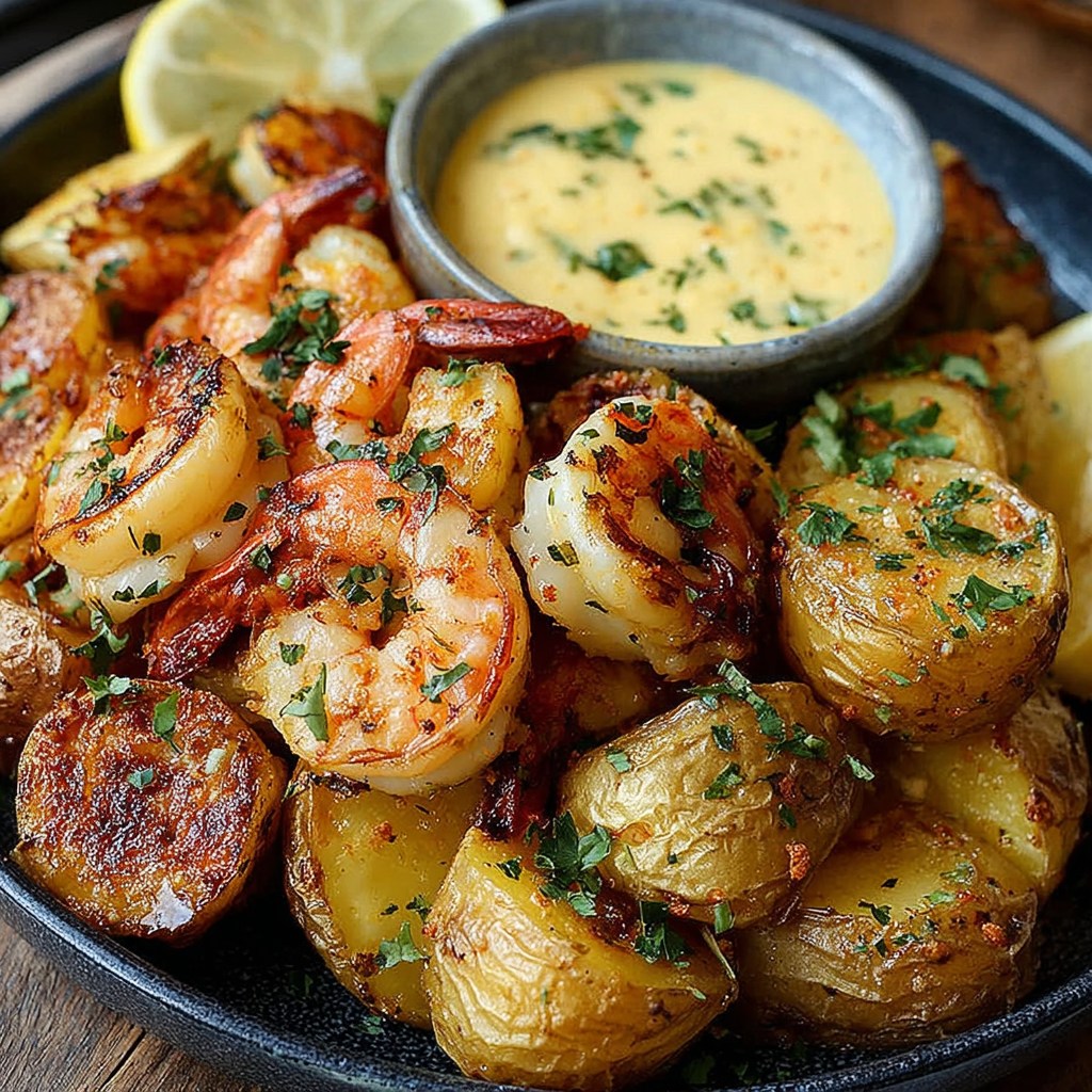 Crevettes poêlées & pommes de terre dorées, sauce citronnée