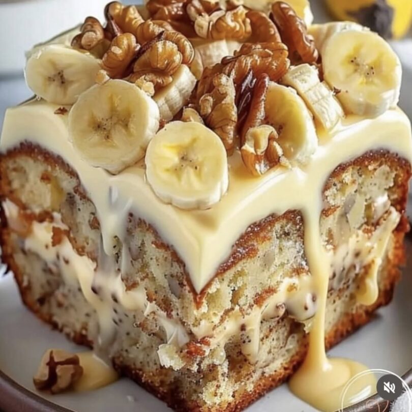 Conclusion : Ce gâteau banane-noix est un vrai régal ! La banane rend le gâteau encore plus moelleux, tandis que les noix lui apportent une note noisettée. Le pudding à la vanille apporte une touche finale et une texture onctueuse. Un dessert idéal en toute occasion !