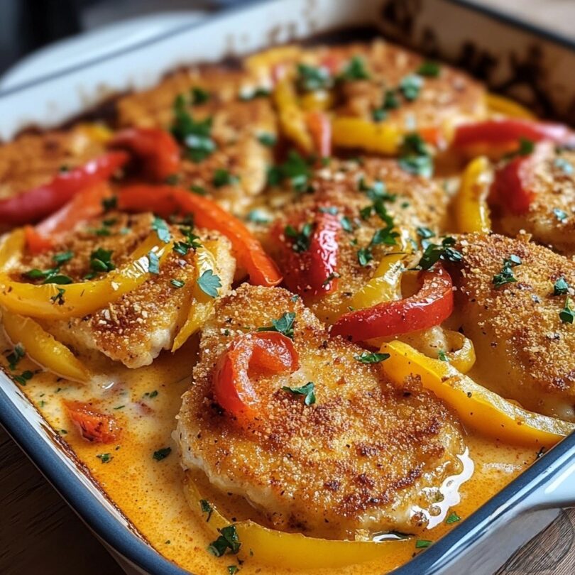 4. Garnissez les escalopes. Répartir uniformément le mélange de poivrons et d’oignons sur les escalopes dans le plat de cuisson. Verser la sauce à la crème et au paprika sur les escalopes et parsemer de fromage râpé. Le fromage crée une délicieuse croûte dorée qui complète parfaitement le plat.