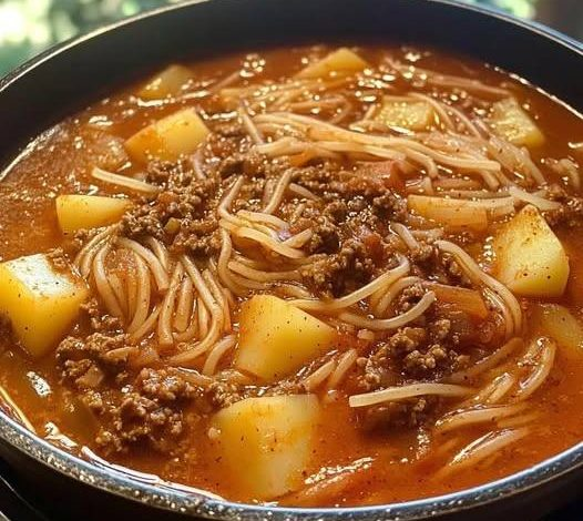Ce généreux plat de Fideo aux pommes de terre et au bœuf haché est un repas réconfortant et facile à préparer. Dans cette recette, des vermicelles dorés mijotent dans un riche bouillon de tomates et de poulet avec de tendres pommes de terre et du bœuf haché assaisonné, pour un résultat savoureux et rassasiant.