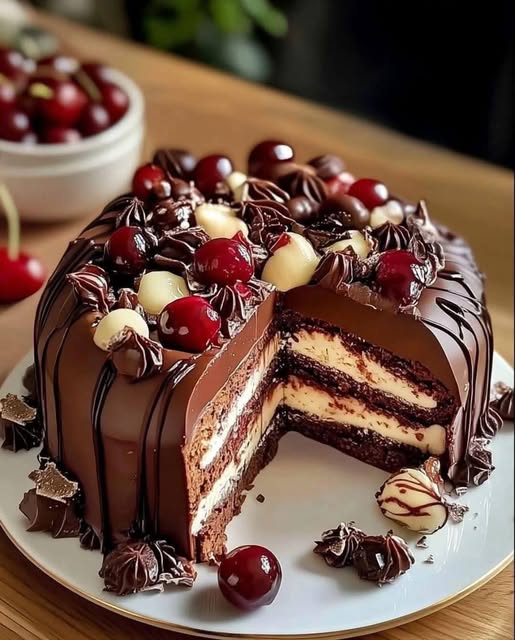 Décoration : Étalez le reste de crème fouettée sur le gâteau et parsemez de copeaux de chocolat. Garnissez de cerises fraîches pour une belle présentation.