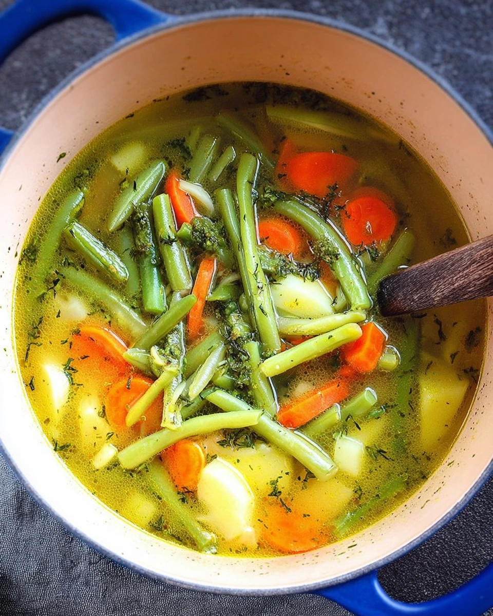 Rien ne vaut une marmite de soupe aux haricots verts et légumes mijotant doucement sur le feu pour réchauffer les cœurs et les estomacs. Riche en couleurs, en vitamines et en goût, cette soupe maison est idéale pour un repas léger mais nourrissant, que ce soit en hiver pour se réchauffer ou en été pour profiter de légumes frais.