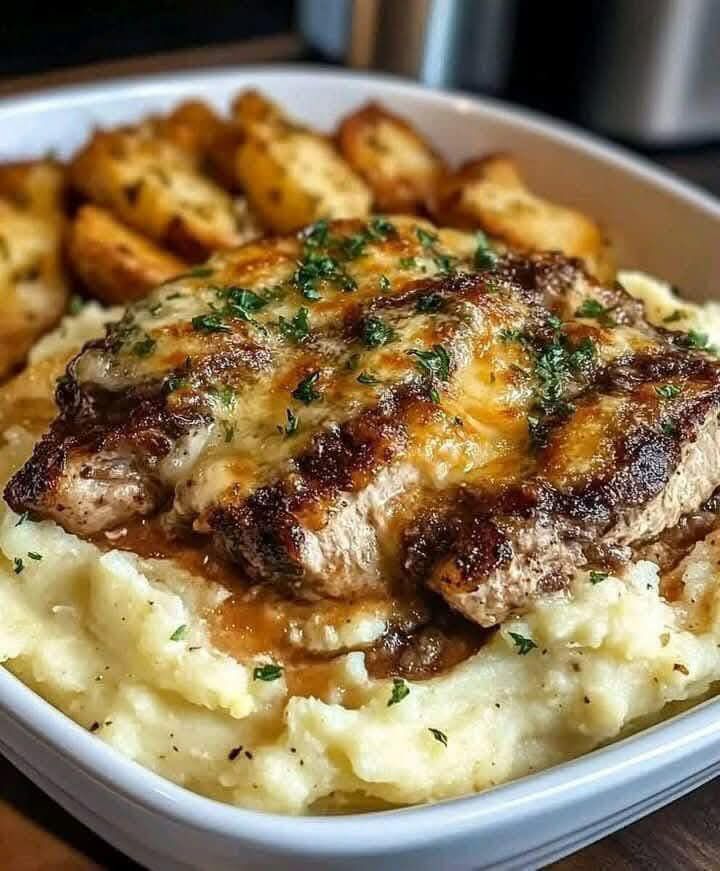 Poulet et steak au parmesan et à l’ail, accompagnés d’une purée de pommes de terre au fromage
