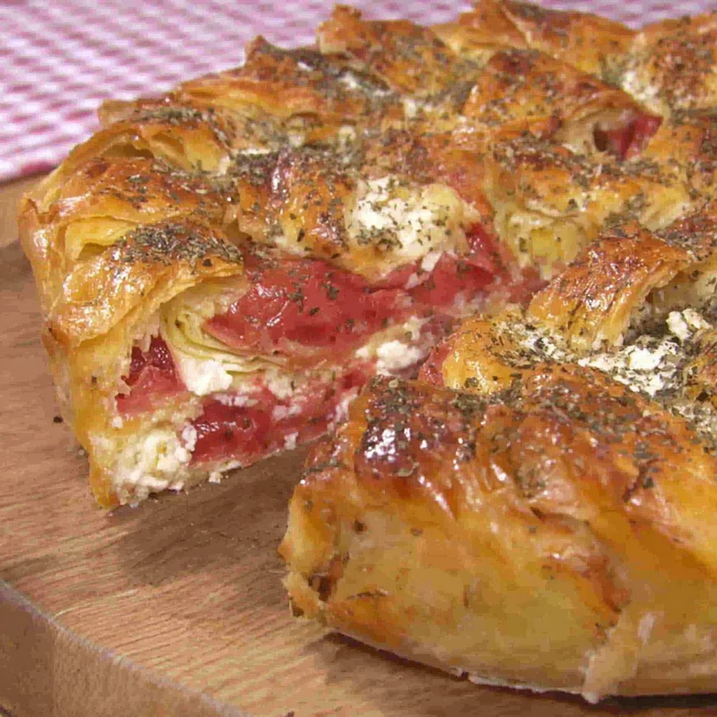 Tarte salée croustillante aux lardons, fromage fondant et tomates cerises