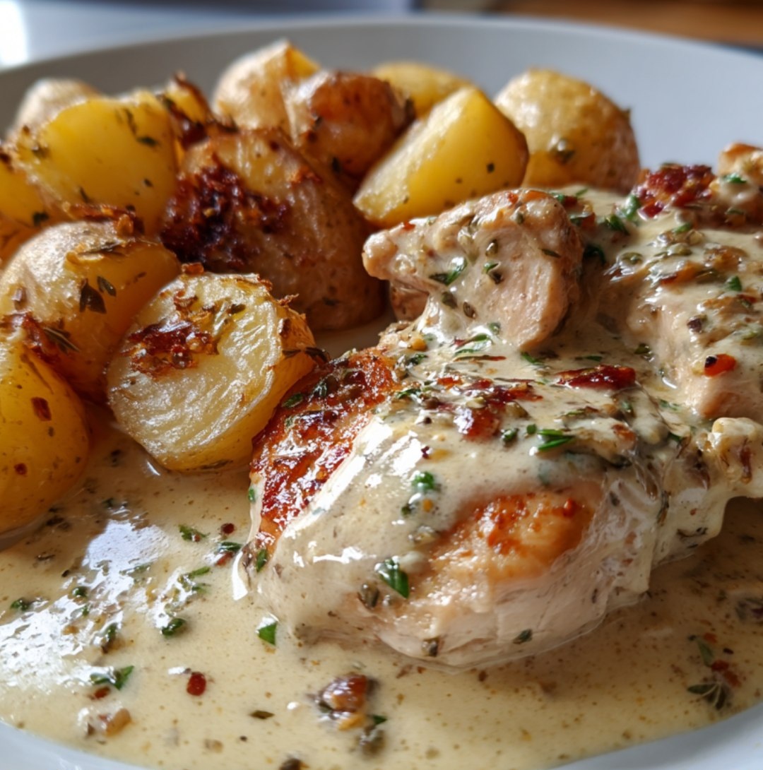 Poulet crémeux à l’ail avec pommes de terre grenaille rôties
