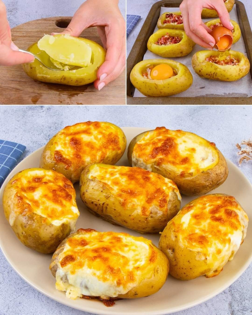 3 Placer les pommes de terre sur une plaque de cuisson recouverte de papier sulfurisé et garnir de fromage et de bacon. Casser l’œuf dans chaque pomme de terre et parsemer de fromage.