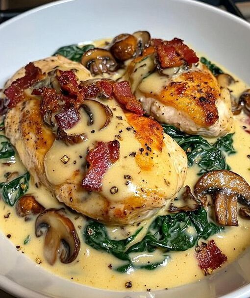 Poulet aux épinards avec 250 g de champignons dans une délicieuse sauce à l’ail