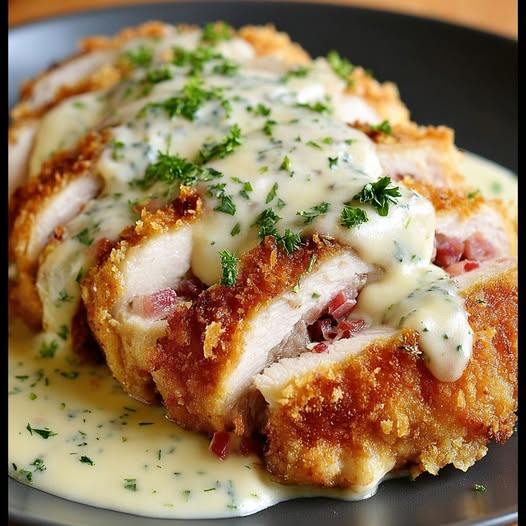 Le Poulet Cordon Bleu est un grand classique : une escalope de poulet farcie au jambon et au fromage, panée et dorée à la perfection. Cette version allie un enrobage bien croustillant à un fromage fondant qui s’échappe à la découpe.