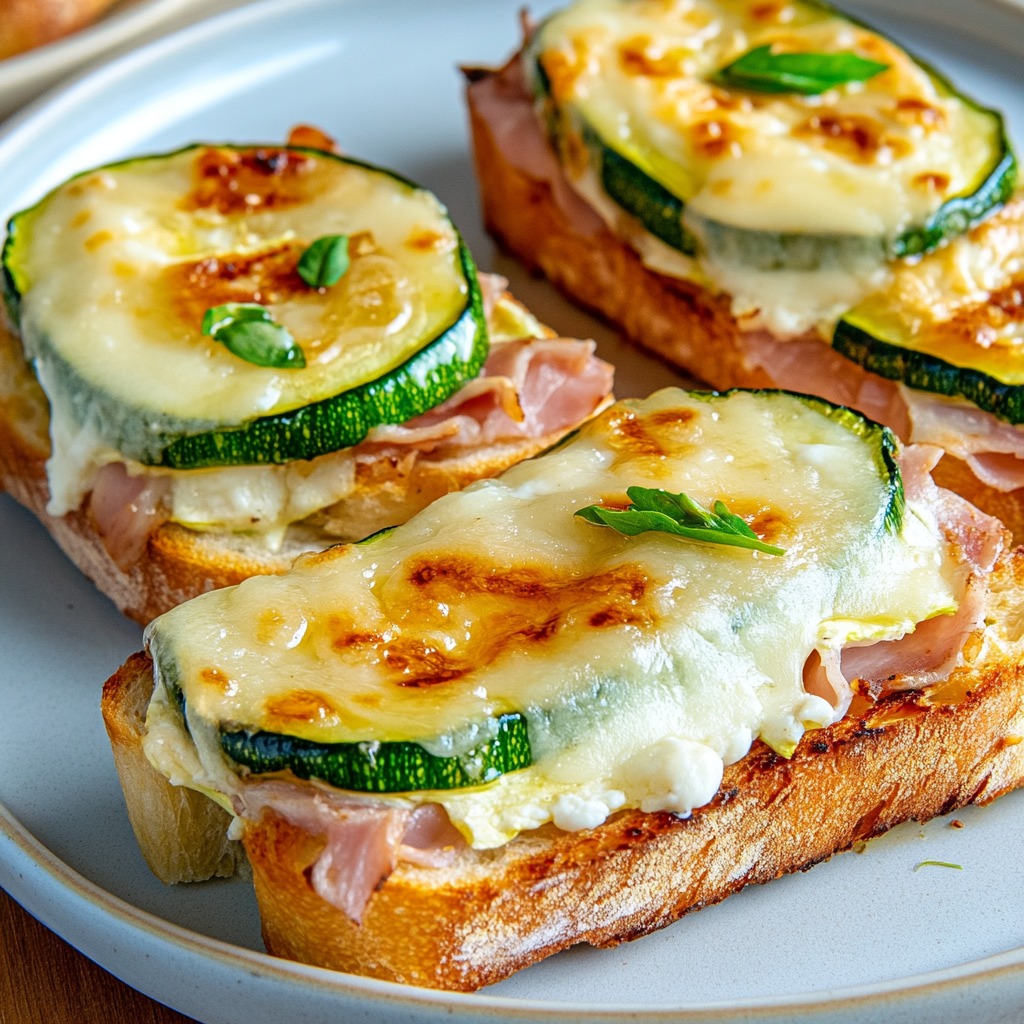 Disposer les tranches de pain sur une plaque de cuisson. Déposer un demi-tranche de jambon sur chaque tartine, puis quelques rondelles de courgettes.