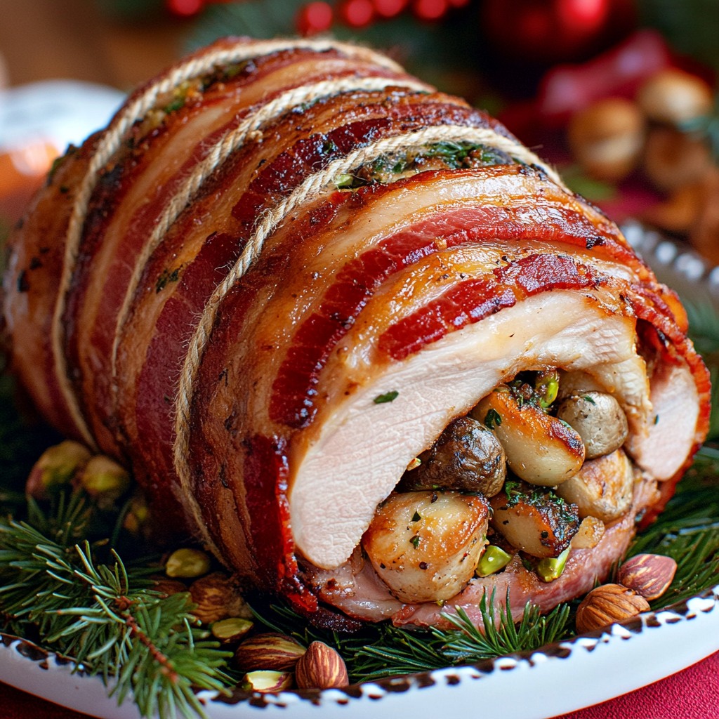 Rôti de dinde farci champignons, pistaches et lard fumé