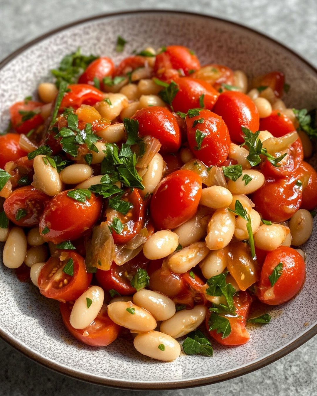 Lavez et coupez les tomates en quartiers. Pelez l’oignon et émincez-le finement ou en rondelles. Égouttez et rincez les haricots. Hachez le persil.