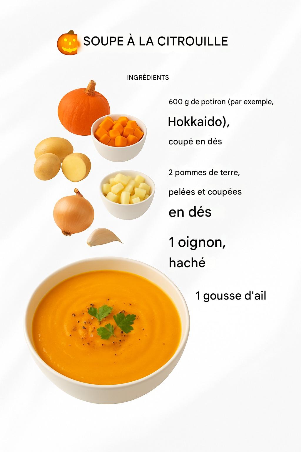 • 600 g de potiron (par exemple, de la variété Hokkaido), coupé en dés • 2 pommes de terre, pelées et coupées en dés • 1 oignon, haché • 1 gousse d’ail • 1 morceau de gingembre (environ 2 cm), finement râpé • 1 cuillère à soupe d’huile • 700 ml de bouillon de légumes • 150 ml de crème ou de lait de coco • Sel et poivre • Graines de potiron et persil pour la garniture