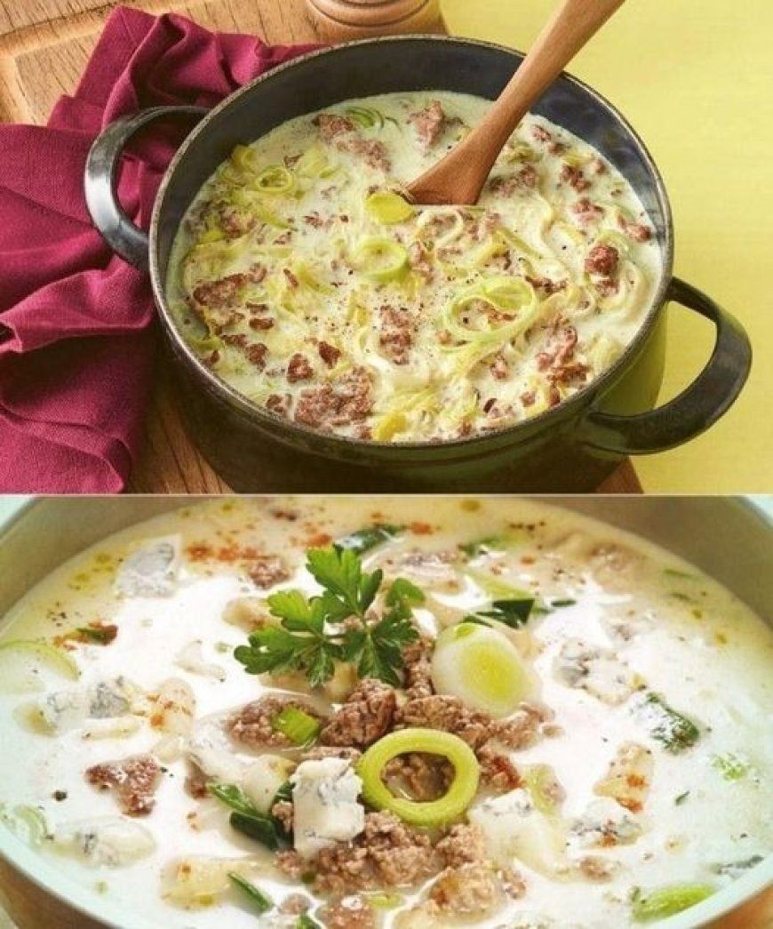 Pendant ce temps, verser l’huile dans une grande casserole. Faire dorer le bœuf haché de tous les côtés, saler et poivrer. Parer le poireau, le couper en rondelles et l’ajouter au bœuf haché. Faire revenir environ 5 minutes. Ajouter l’eau, les cubes de bouillon et laisser mijoter à feu doux environ 10 minutes. Incorporer le fromage frais et le laisser fondre. Incorporer la crème fraîche et porter à nouveau à ébullition. Assaisonner généreusement la soupe avec du sel, du poivre, de la muscade, de l’ail en poudre et de l’oignon en poudre.