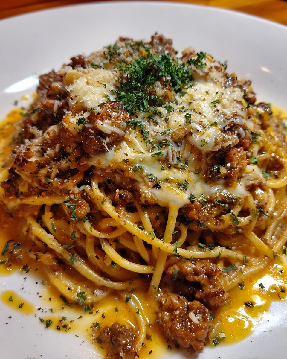 🍝 Spaghetti crémeux au beurre à l’ail et bœuf parmesan