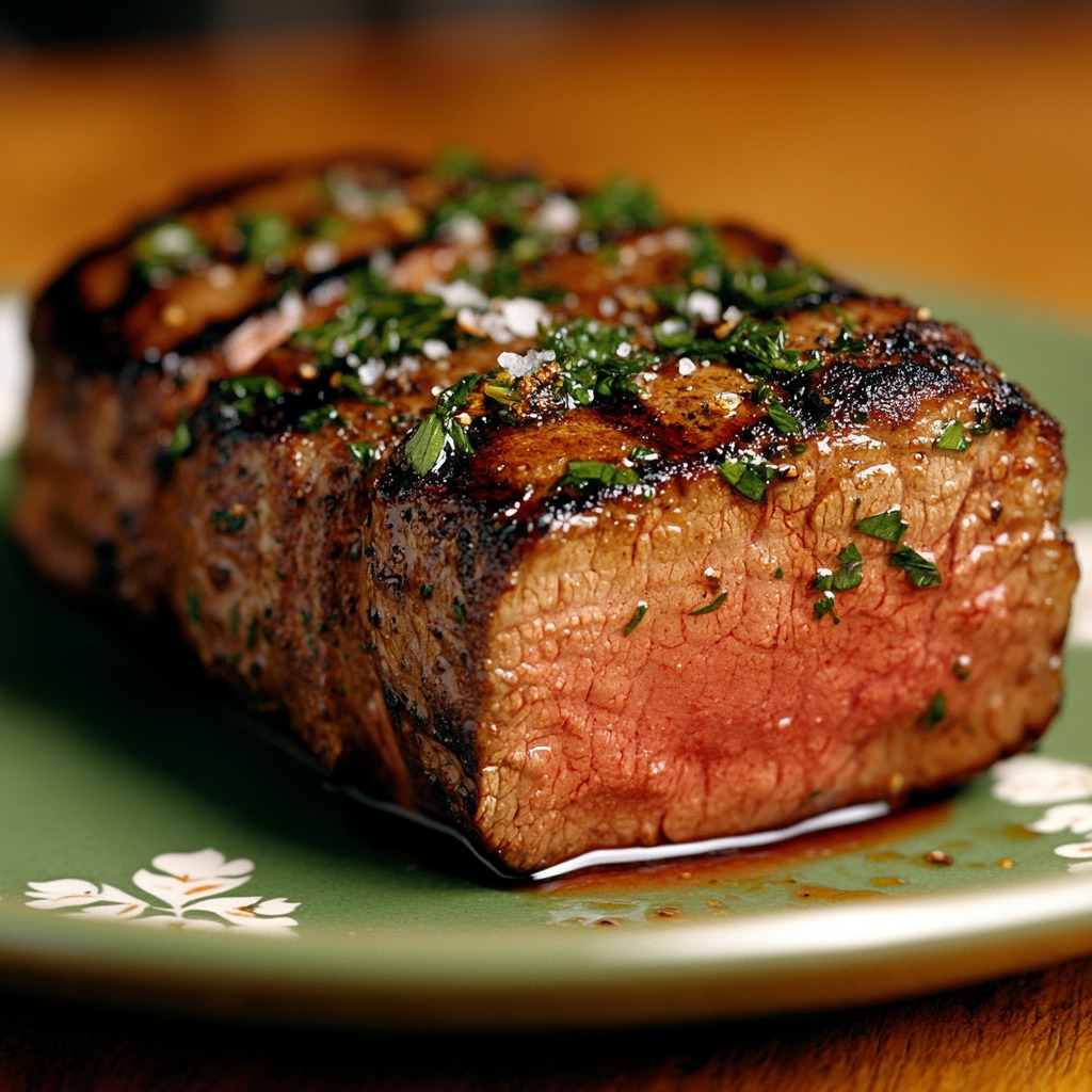 Steak de bœuf grillé, jus maison & herbes fraîches