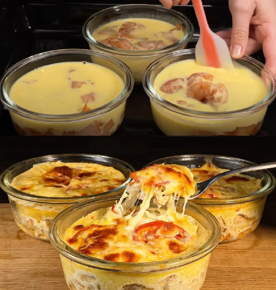 Le Grand Assemblage : Remettez les filets de poulet dorés dans la poêle avec les tomates et les oignons. Versez uniformément le mélange d’œufs sur le poulet et les légumes.
